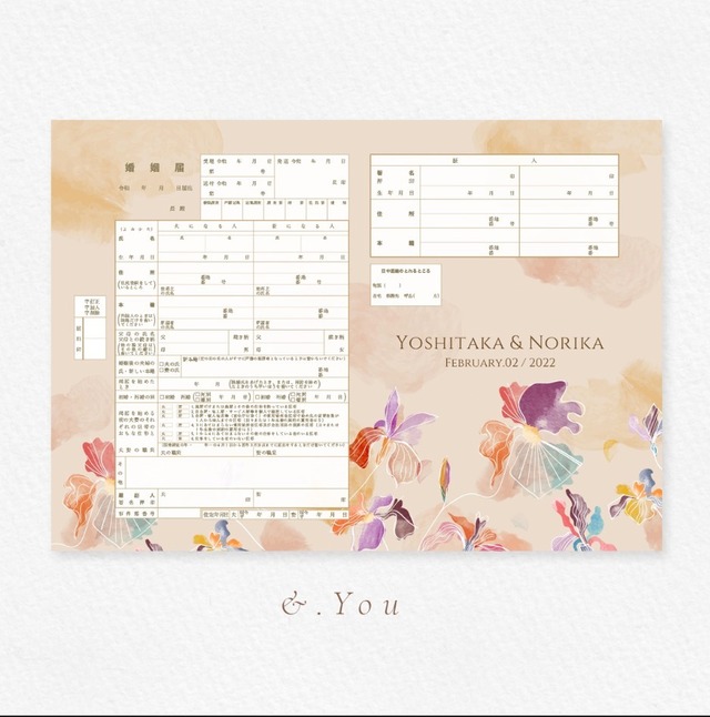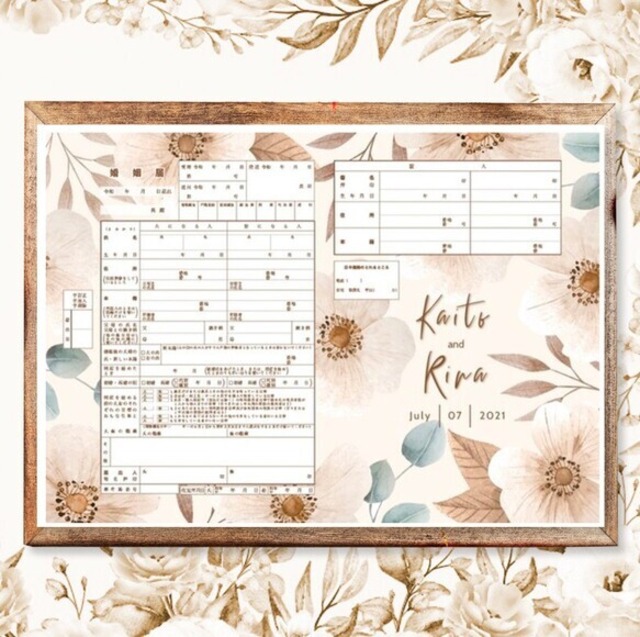 落ち着いたベージュブラウンカラーの水彩花柄 大人っぽいオリジナル婚姻届 ウエディング 名入れ 名入り