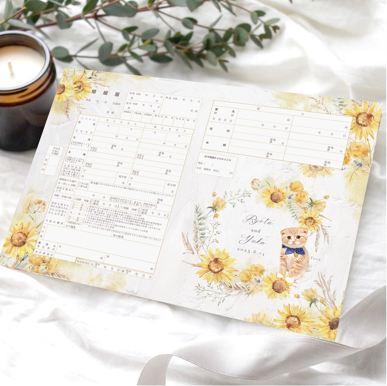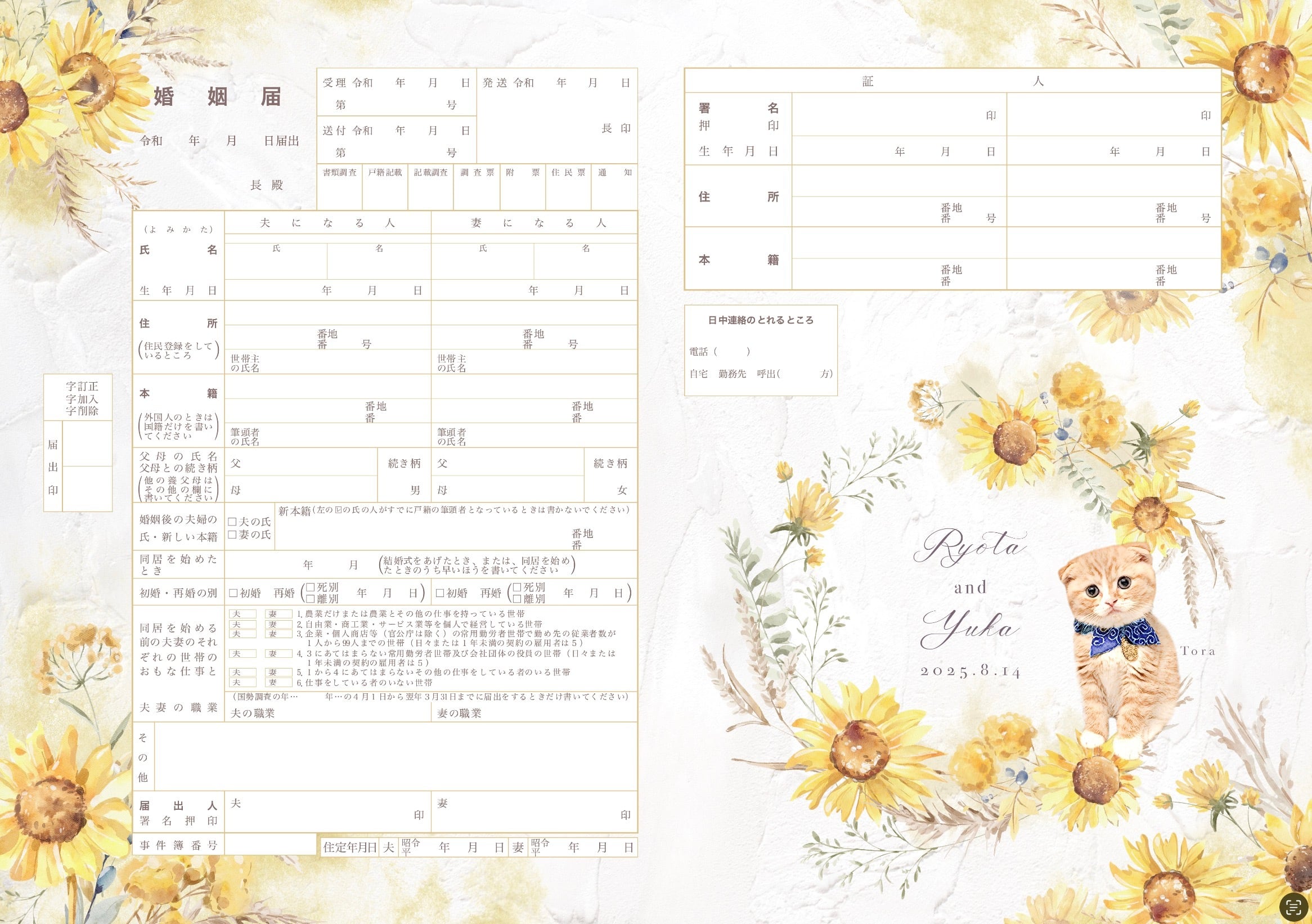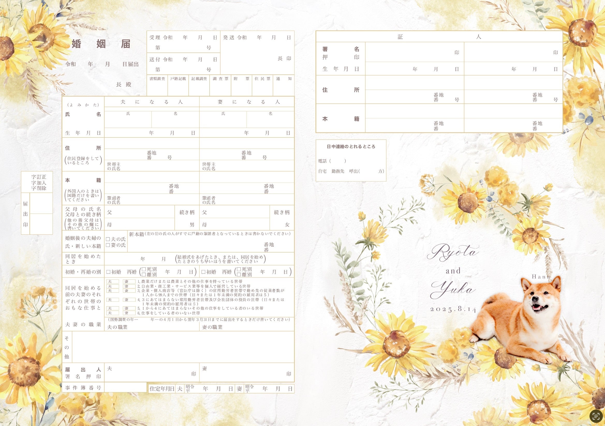 ペットの写真が入った、デジタルスケッチ加工・ひまわりヒマワリ★お洒落で可愛い婚姻届 切り抜き写真入れた完全オーダーメイド 愛犬 猫 写真入れ 文字入れ日付入れ 世界でたった1つの婚姻届