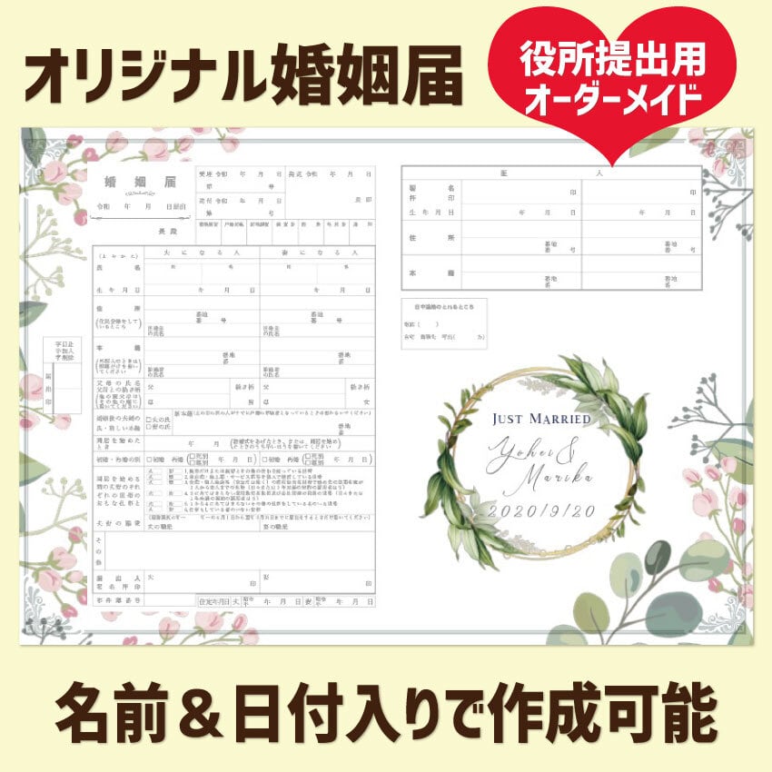 ボタニカルリーフ ナチュラルな 婚姻届 名入れ 日付入れ オーダーメイド オリジナル 指輪置き