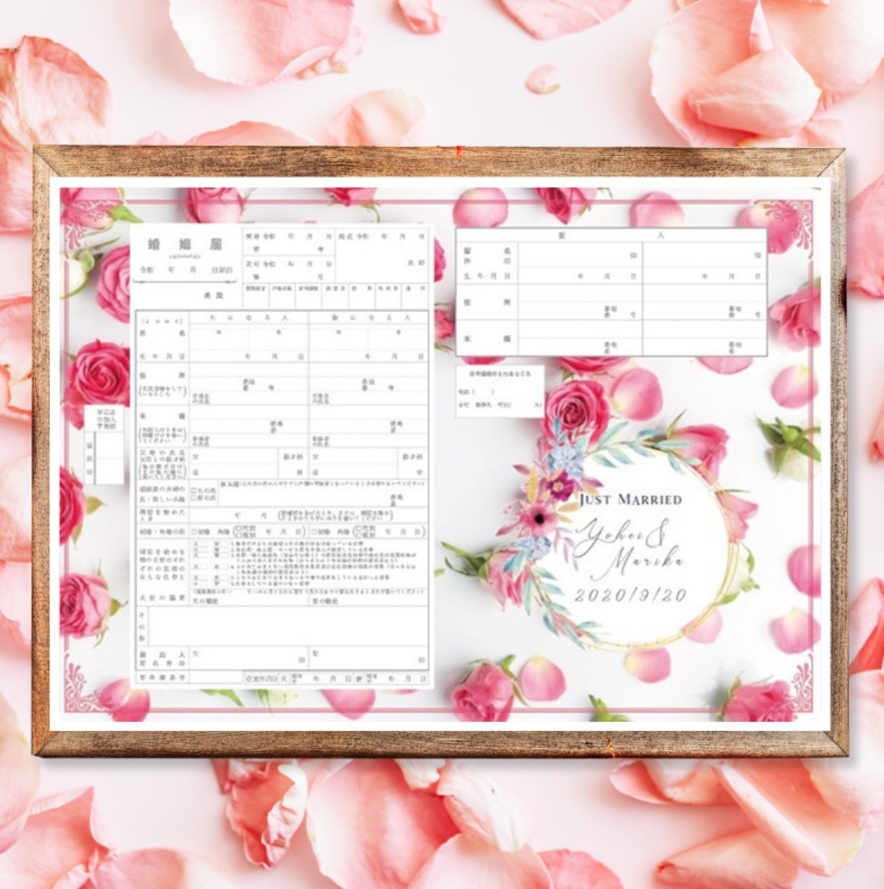 ピンクの花柄 婚姻届 名入れ 日付入れ オーダーメイド オリジナル 指輪置き