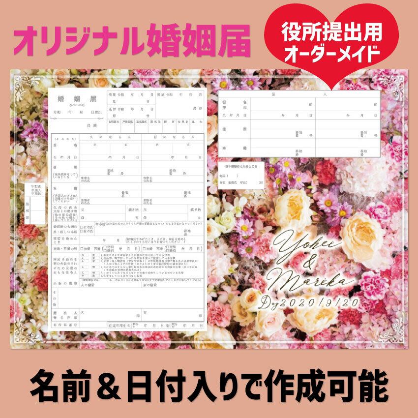 ピンクの花柄 薔薇 婚姻届 名入れ 日付入れ オーダーメイド オリジナル 指輪置き