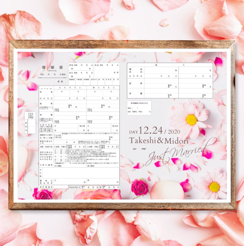 ピンクのフラワーペタル 花柄 婚姻届 名入れ 日付入れ オーダーメイド オリジナル 指輪置き