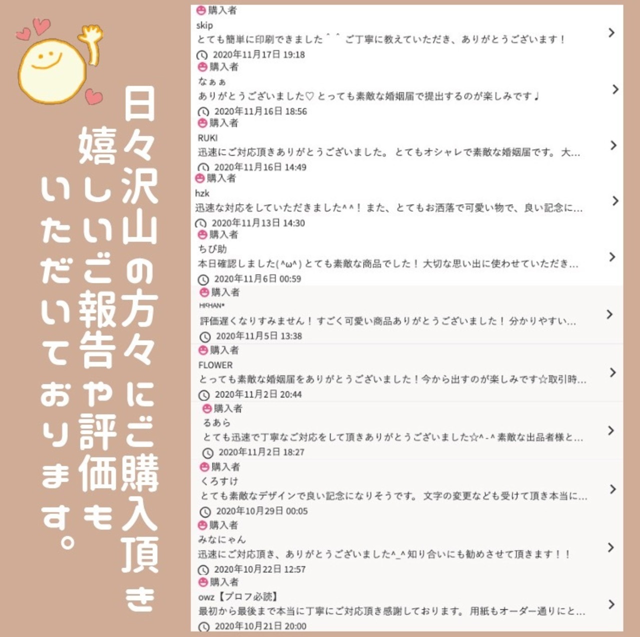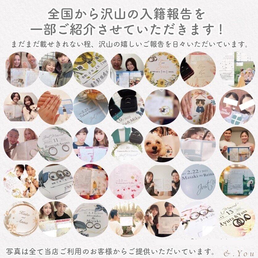 お客様の中にはプロポーズ用として男性からのご依頼、ご友人やお母様から娘さんへのプレゼント等、色々な方からのご注文をお受けしております(*´ω`*)役所の提出用としても使えますが、こちらは保管用としても人気です。10年後…婚姻届書いたねって想い出に浸れますよね。。♡︎