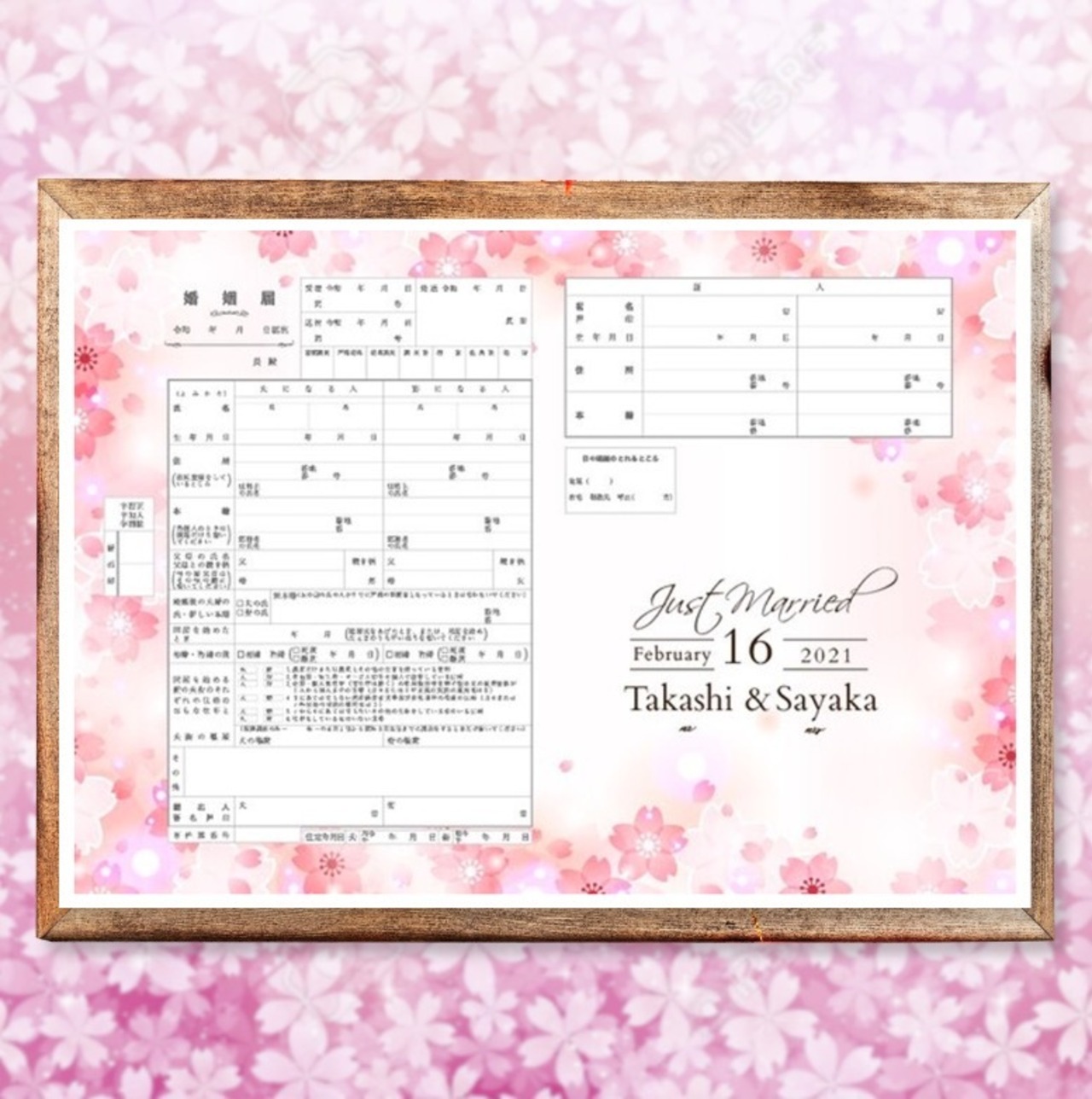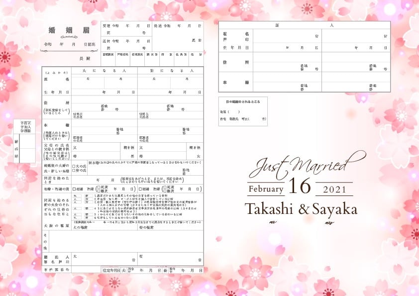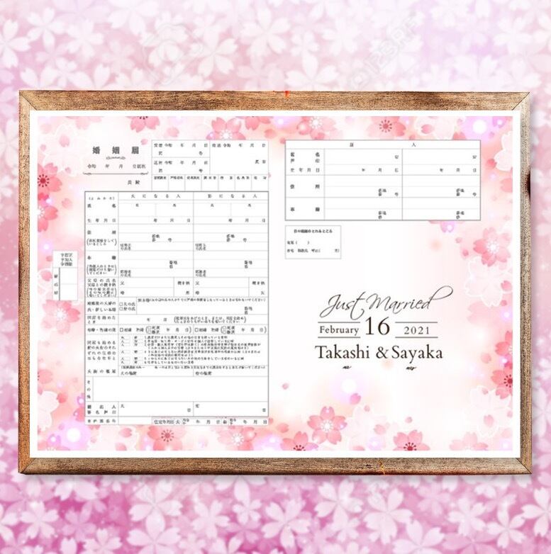 春のサクラ キュートでお洒落な婚姻届 名入れ 日付入れ オーダーメイド オリジナル 桜 フラワー 大理石