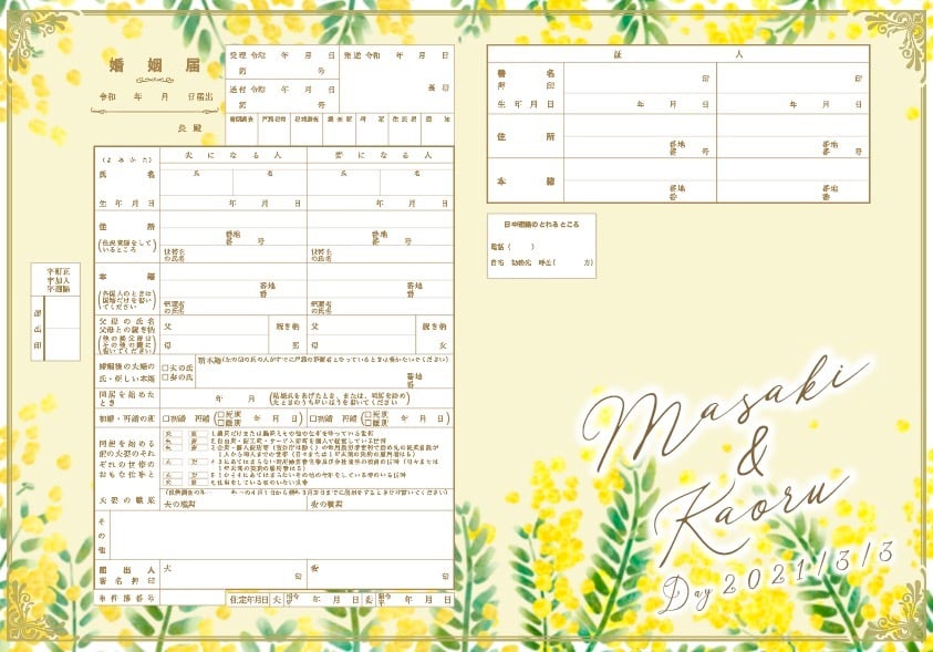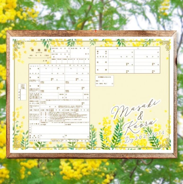 可愛い ミモザ 明るい春の訪れ 婚姻届 黄色 パステルイエロー 名入れ