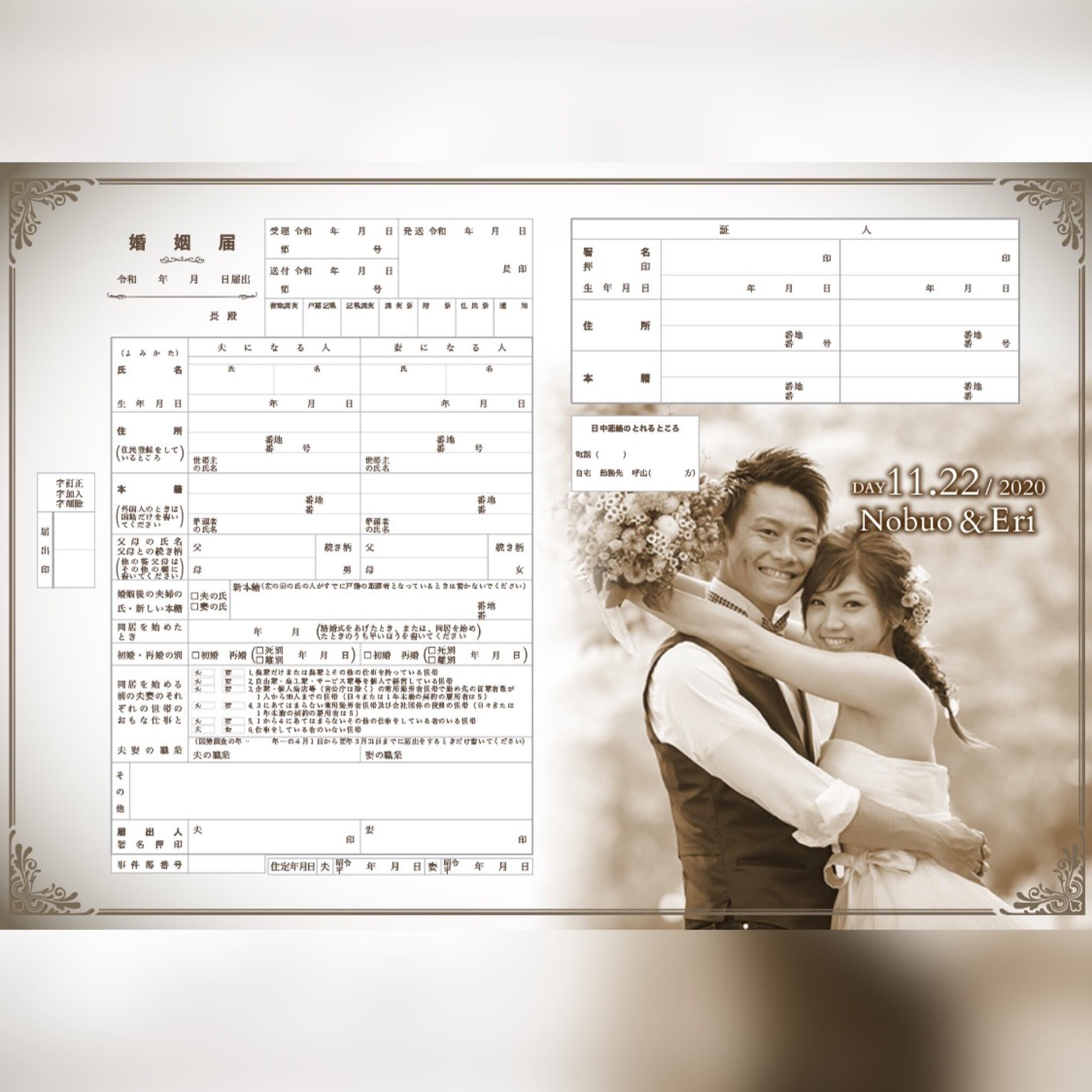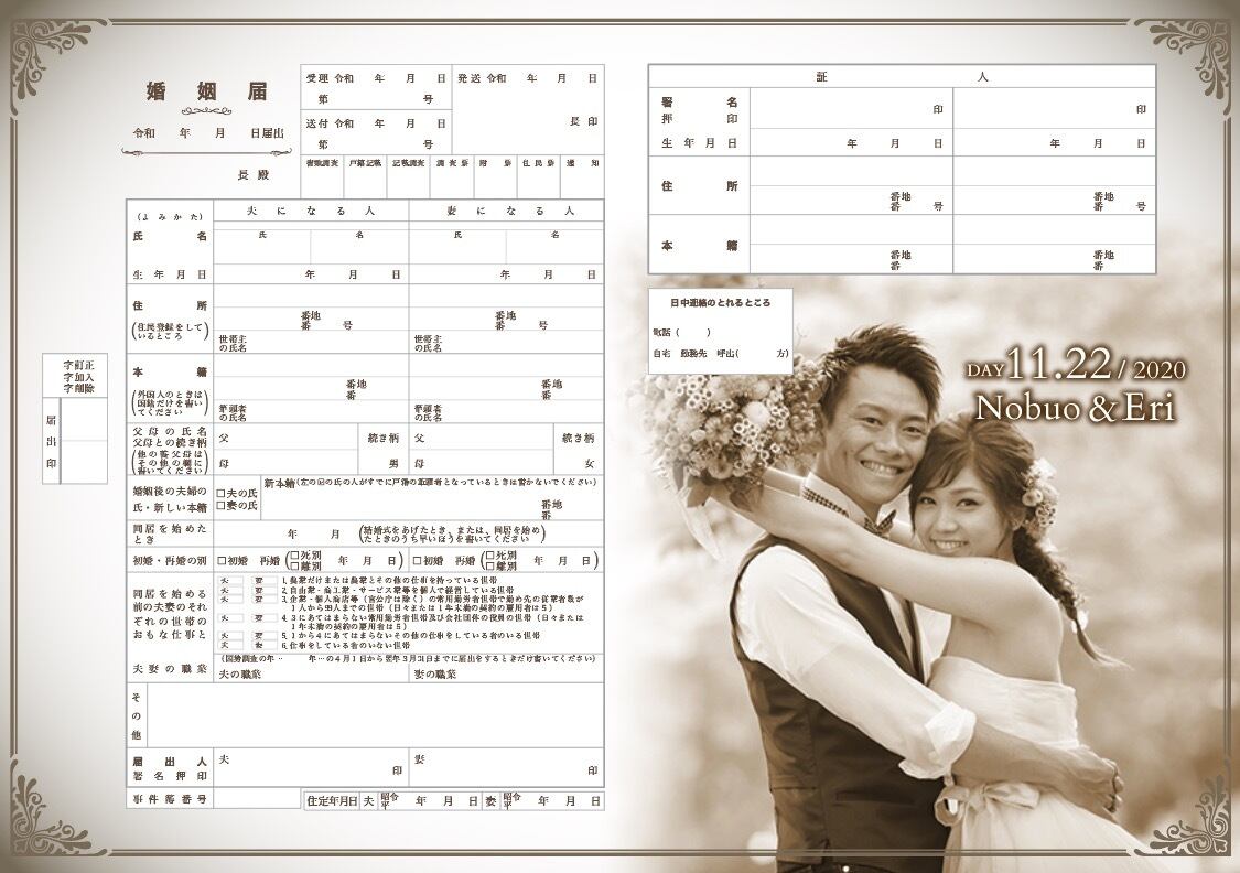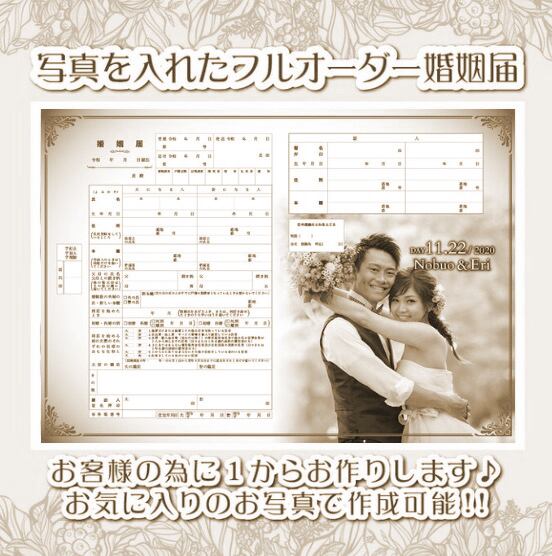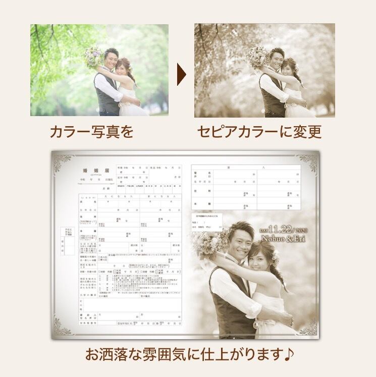 写真をセピアカラーに変更!フルオーダー婚姻届 お好きなお写真でお作りします。写真入れ 名入れ 日付入れ 完全フルオーダーメイド オリジナル