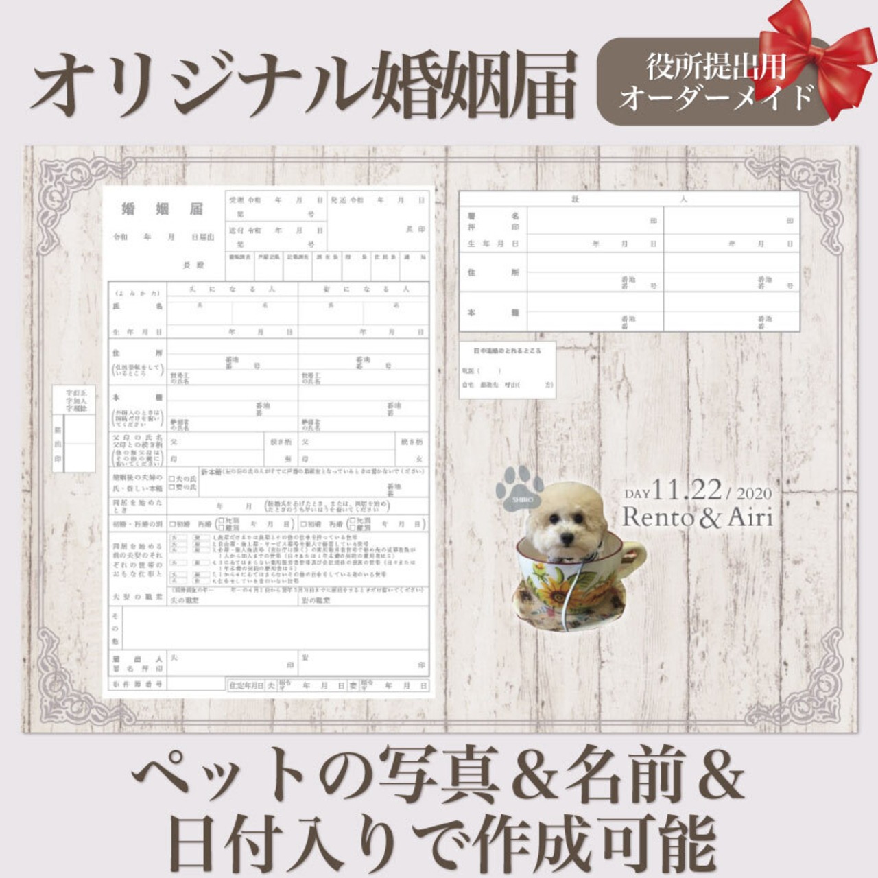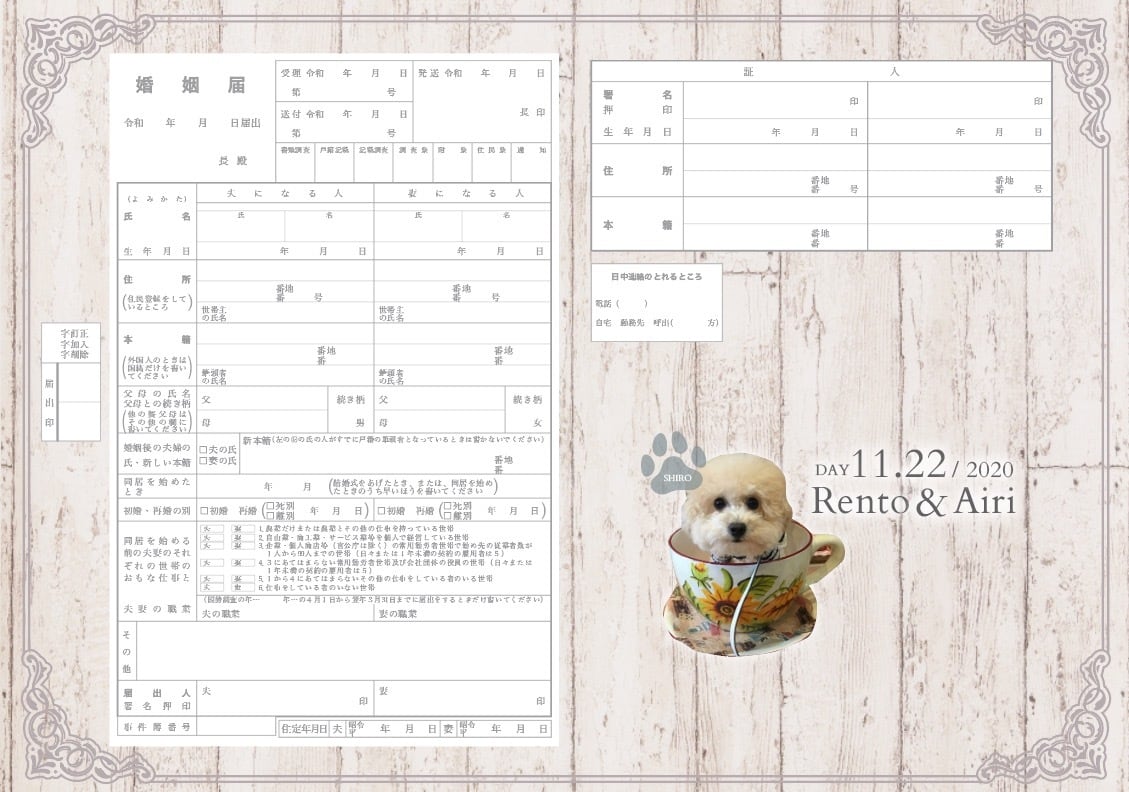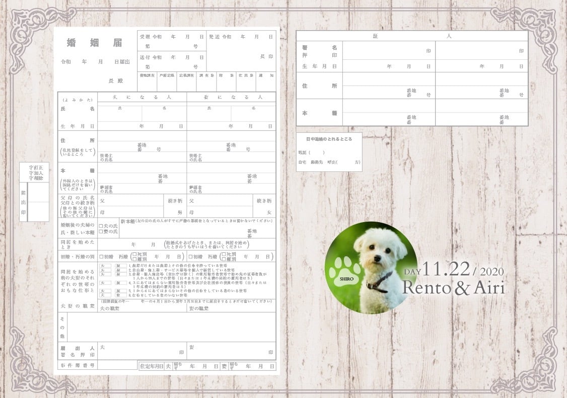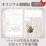 ペットのお写真を入れたセミオーダー婚姻届 ナチュラルウッド お好きなお写真でお作りします。写真入れ 名入れ 日付入れ セミオーダーメイド オリジナル