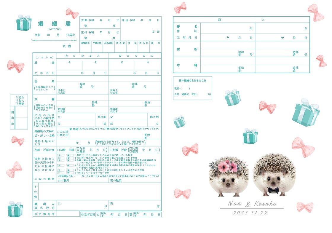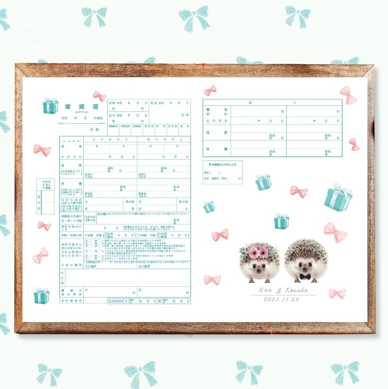 可愛いハリネズミの ティファニーブルー色 リボン婚姻届 名入れ 日付入れ オーダーメイド オリジナル 指輪置き