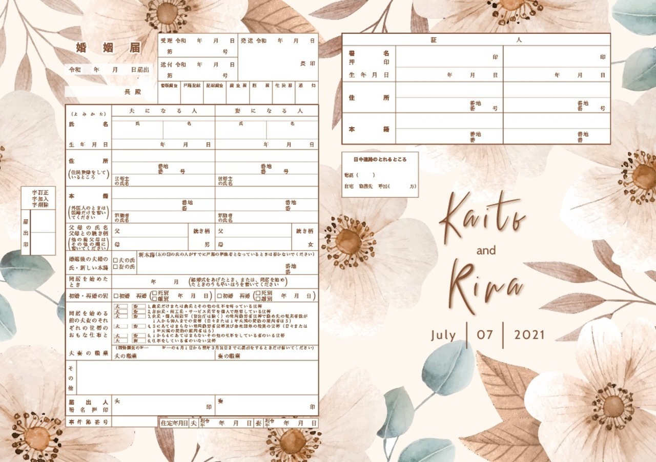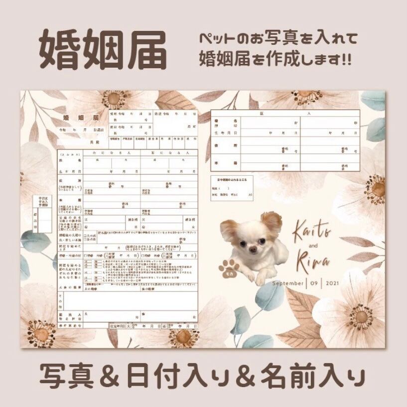 ペットのお写真を入れたセミオーダー婚姻届 落ち着いたベージュ花柄 お好きなお写真でお作りします。写真入れ 名入れ 日付入れ セミオーダーメイド オリジナル