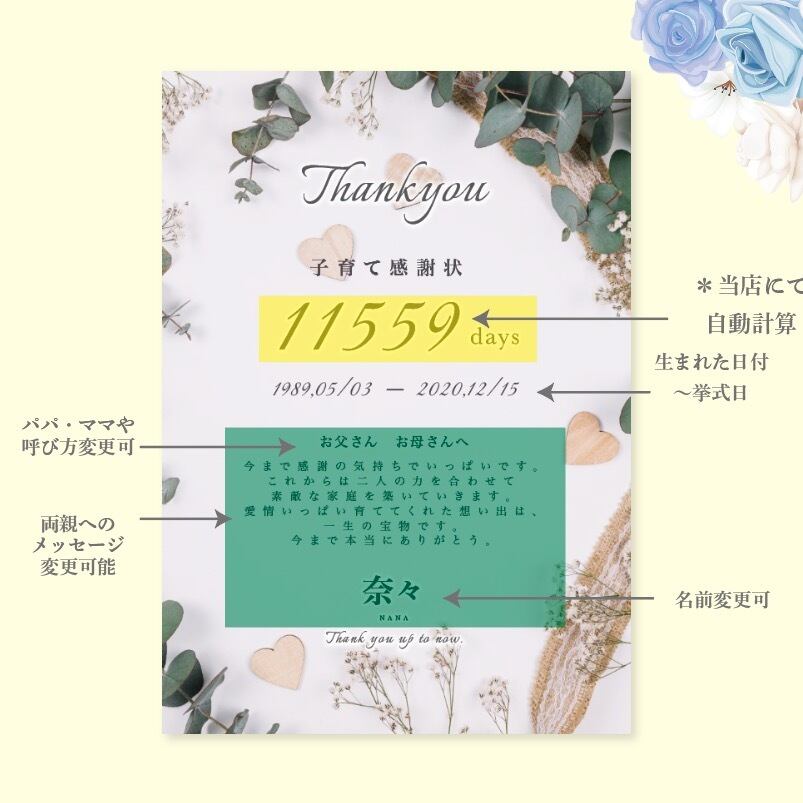 *生まれた日〜挙式日(または入籍日)までの日数を当店で計算してお入れします。