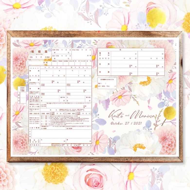 婚姻届 可愛すぎるイチオシ花柄の総柄カラフルフラワー♡︎姫 プリンセス 名入れ日付入りで作成