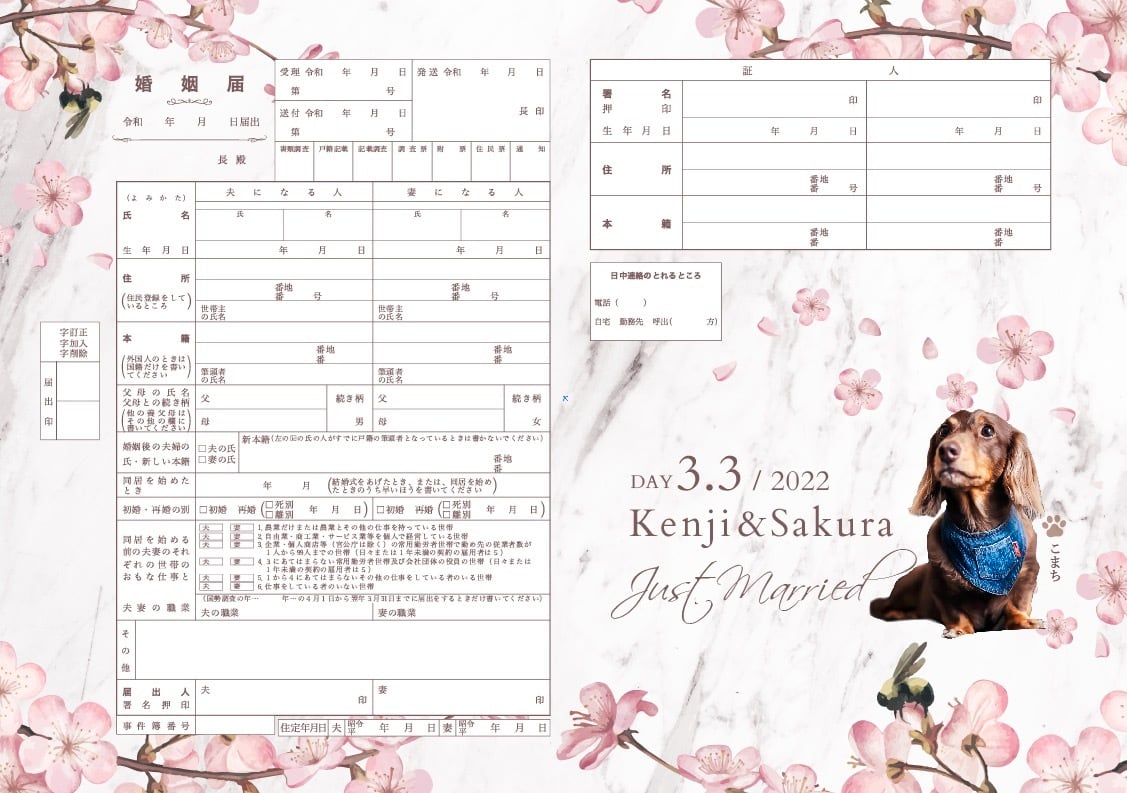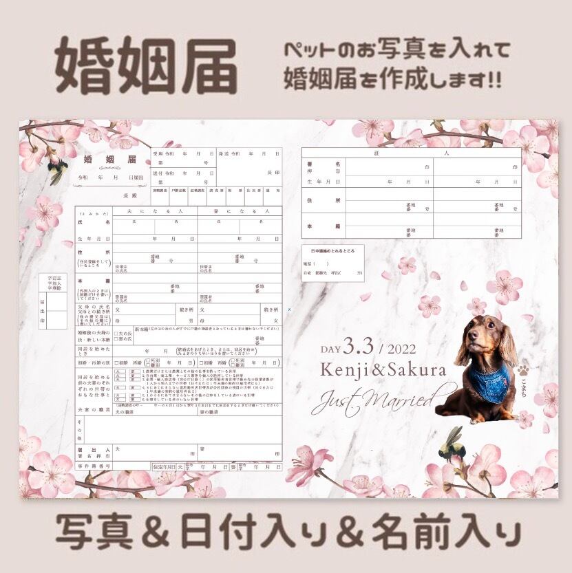 ペットの写真が入った、桜・サクラ・春・大理石・花柄★お洒落で可愛い婚姻届 切り抜き写真入れた完全オーダーメイド 愛犬 猫 写真入れ 文字入れ日付入れ 世界でたった1つの婚姻届