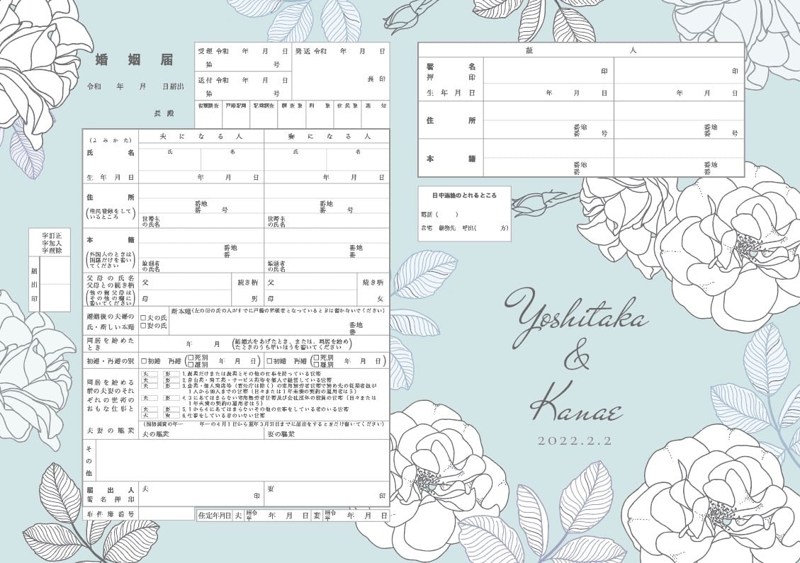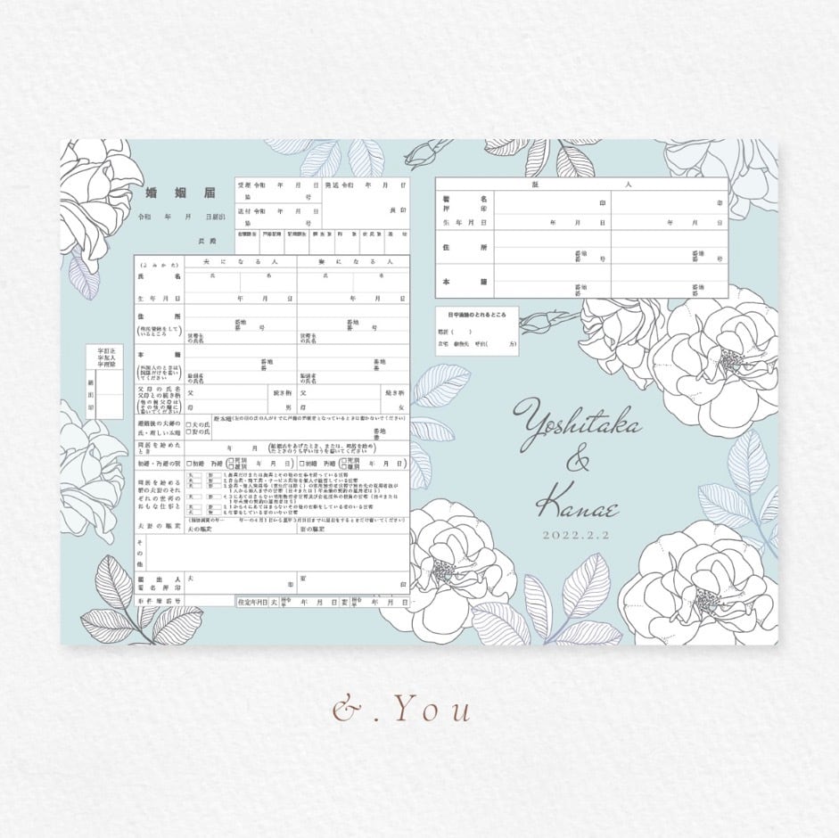 婚姻届 サムシングブルーの 綺麗で美しい花柄 名入れ日付入りで作成