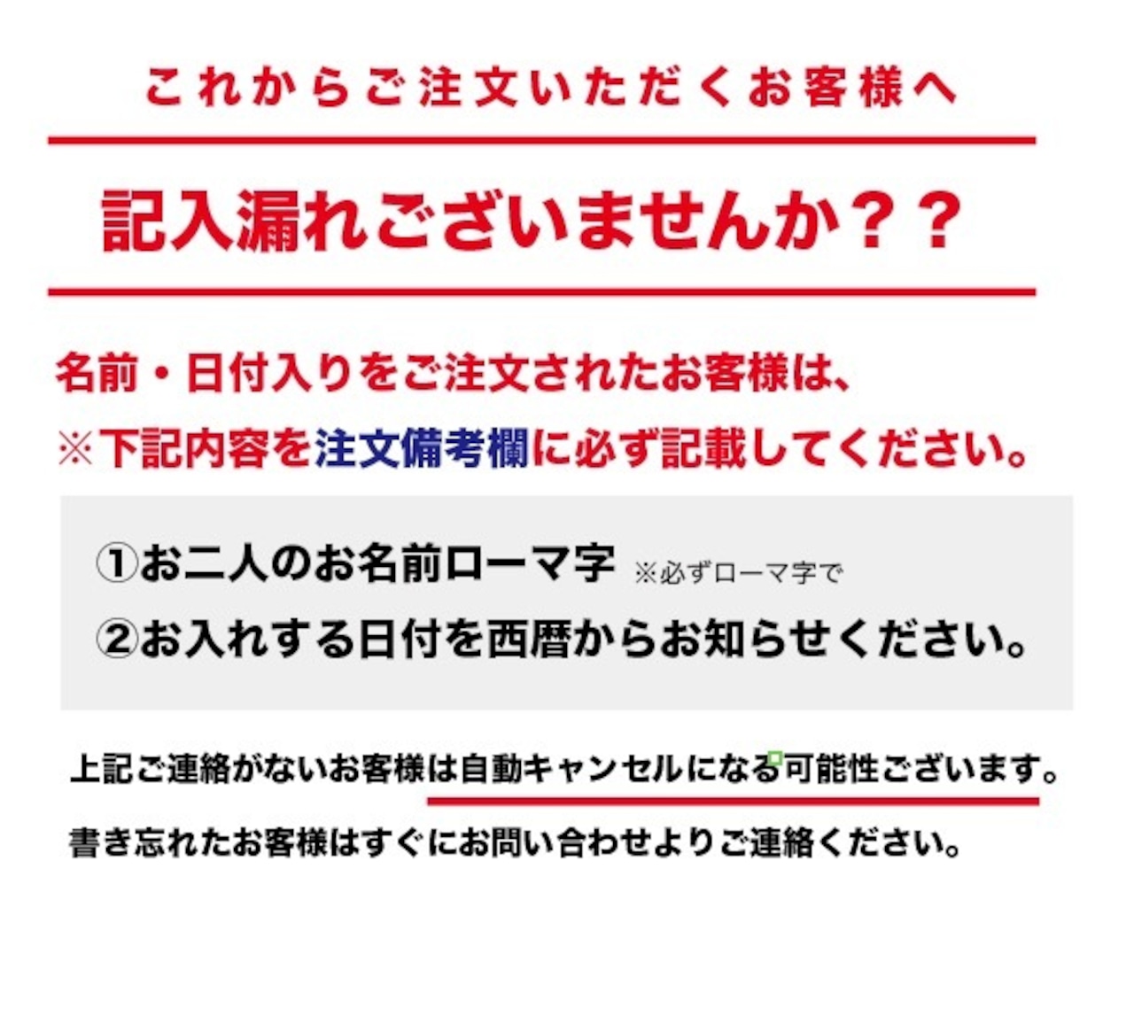 注文備考欄への書き忘れは問い合わせからお知らせください。