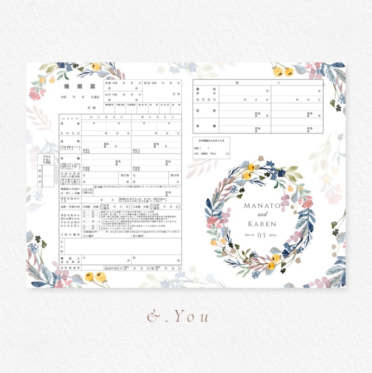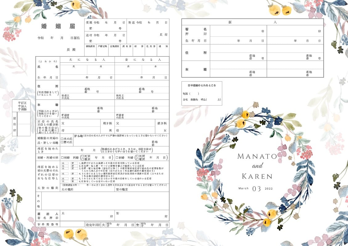 婚姻届 春の訪れ 花輪 リーフ 水彩画フラワー 可愛い 大人柄 名入れ日付入りで作成/結婚式/婚約