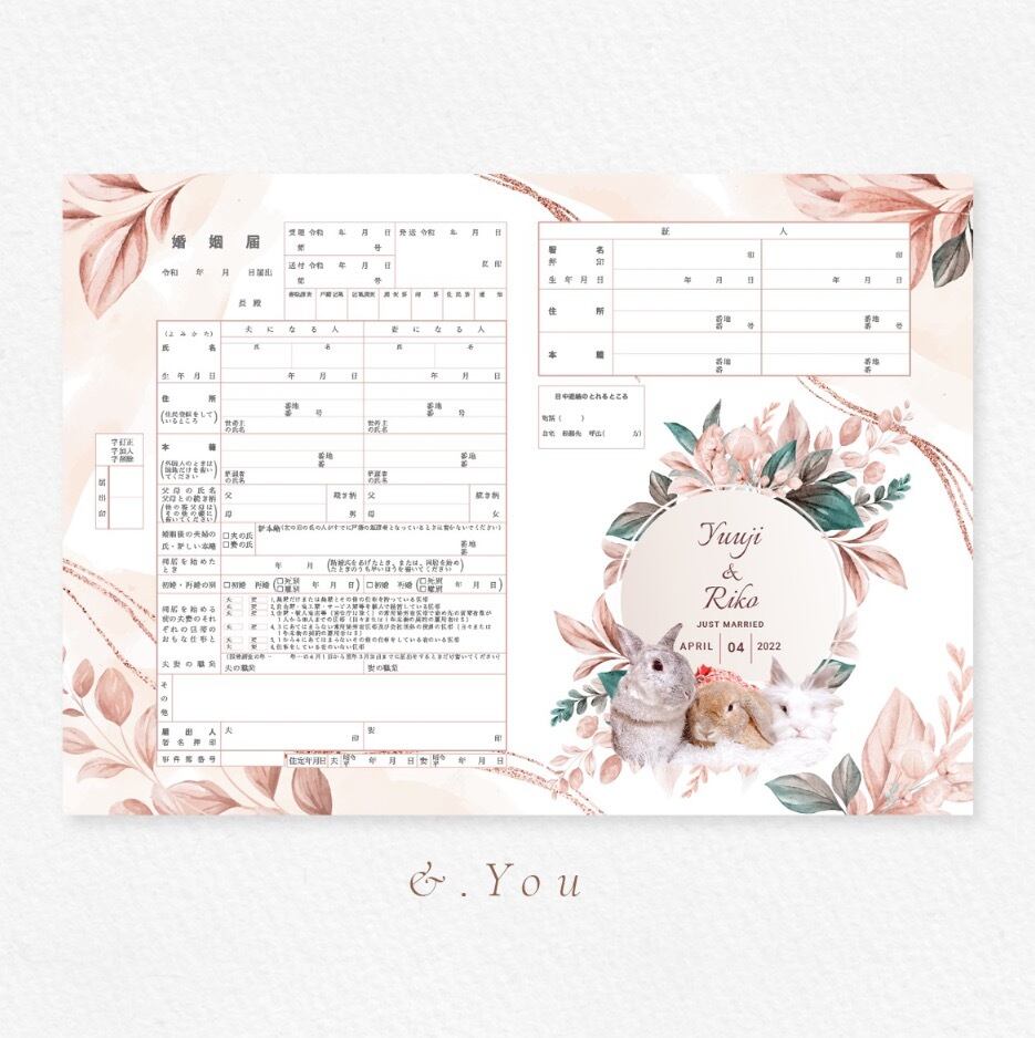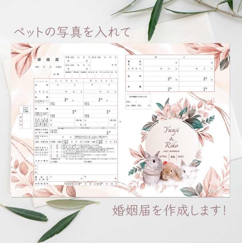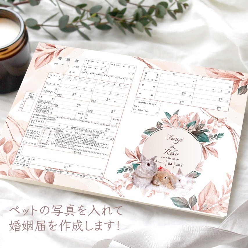 ペットの写真が入った、花柄・ピンク★お洒落で可愛い婚姻届 切り抜き写真入れた完全オーダーメイド 愛犬 猫 写真入れ 文字入れ日付入れ 世界でたった1つの婚姻届