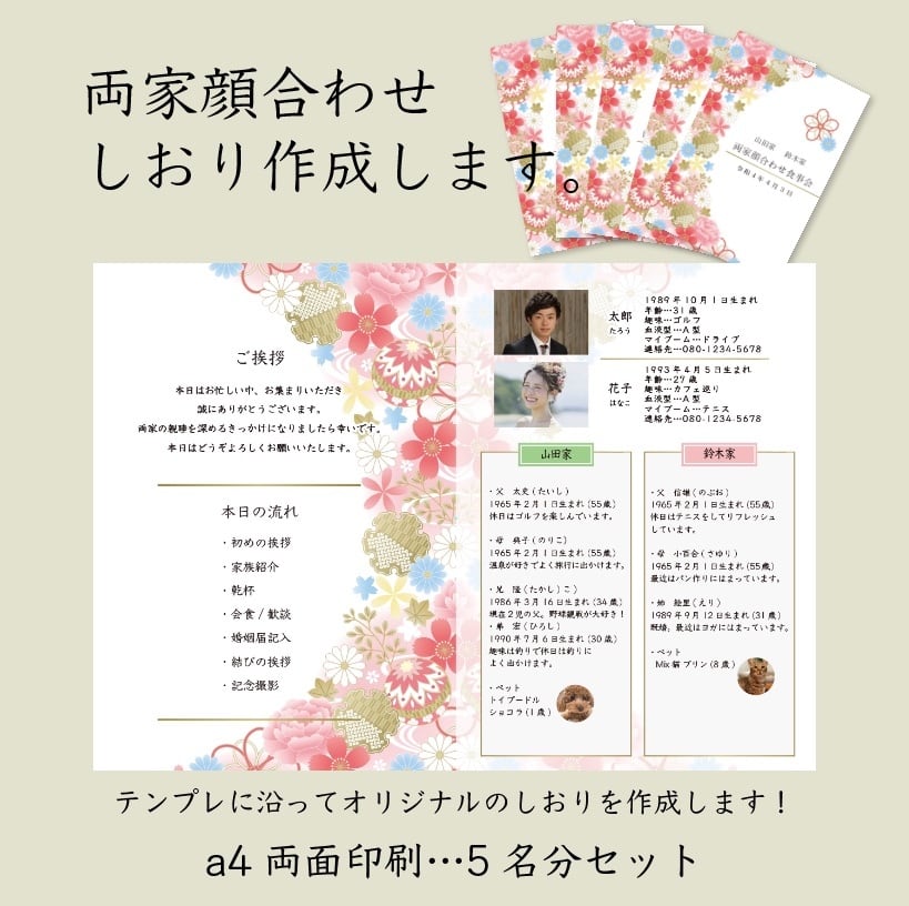 厚紙印刷5セット★両家顔合わせ 結納 しおり プロフィール パンフレット 食事会 家族紹介 結婚 ブライダル 印刷 作成 進行 和柄