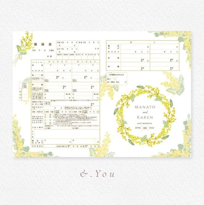 黄色いミモザの婚姻届 春 花輪 リーフ 水彩画フラワー 可愛い 大人柄 名入れ日付入りで作成/結婚式/婚約