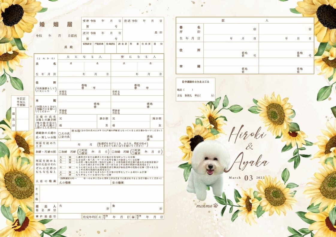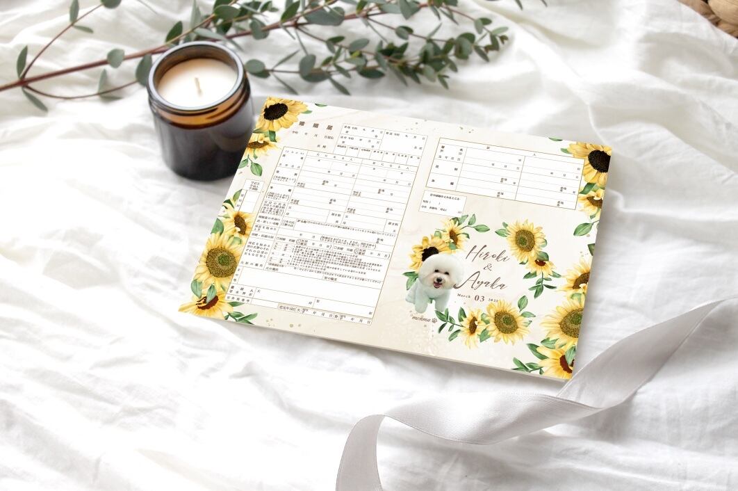 ペットの写真が入った 向日葵 ヒマワリ ひまわり花柄★夏 イエローお洒落で可愛い婚姻届 切り抜き写真入れた完全オーダーメイド 愛犬 猫 写真入れ 文字入れ日付入れ 世界でたった1つの婚姻届
