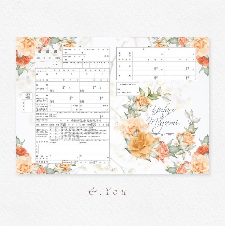 美しいフラワーデザインの婚姻届 大人柄 オレンジ 名入れ日付入りで作成/結婚式/婚約