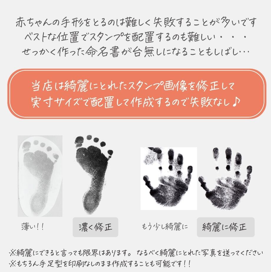 実際のところ綺麗に手形取れないし失敗する事が多く命名書が台無し!