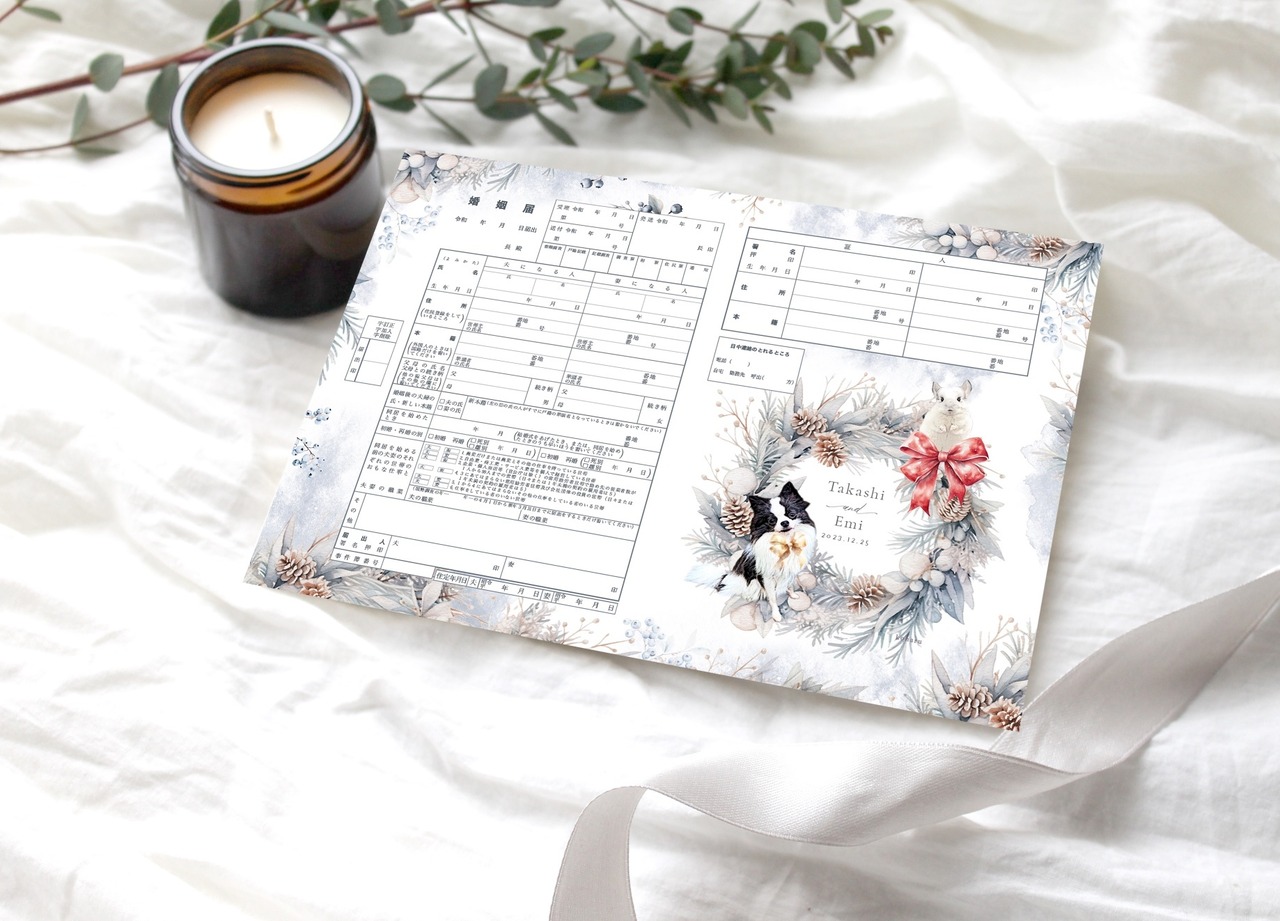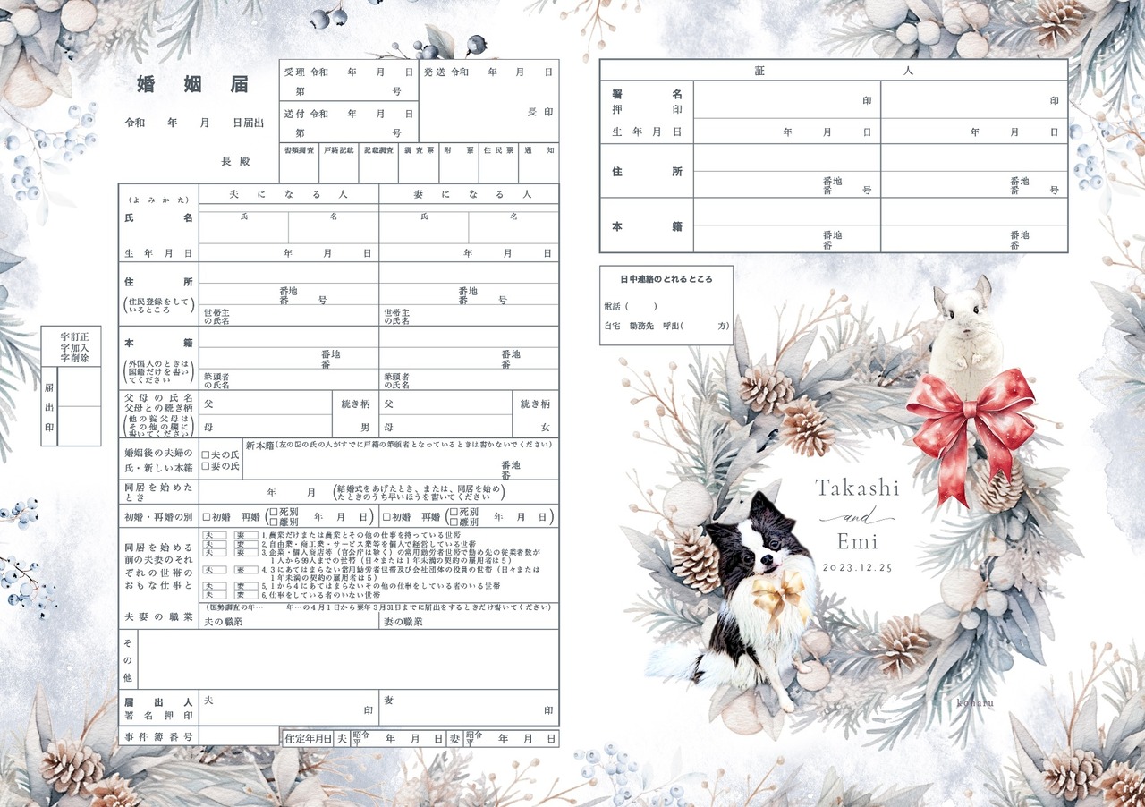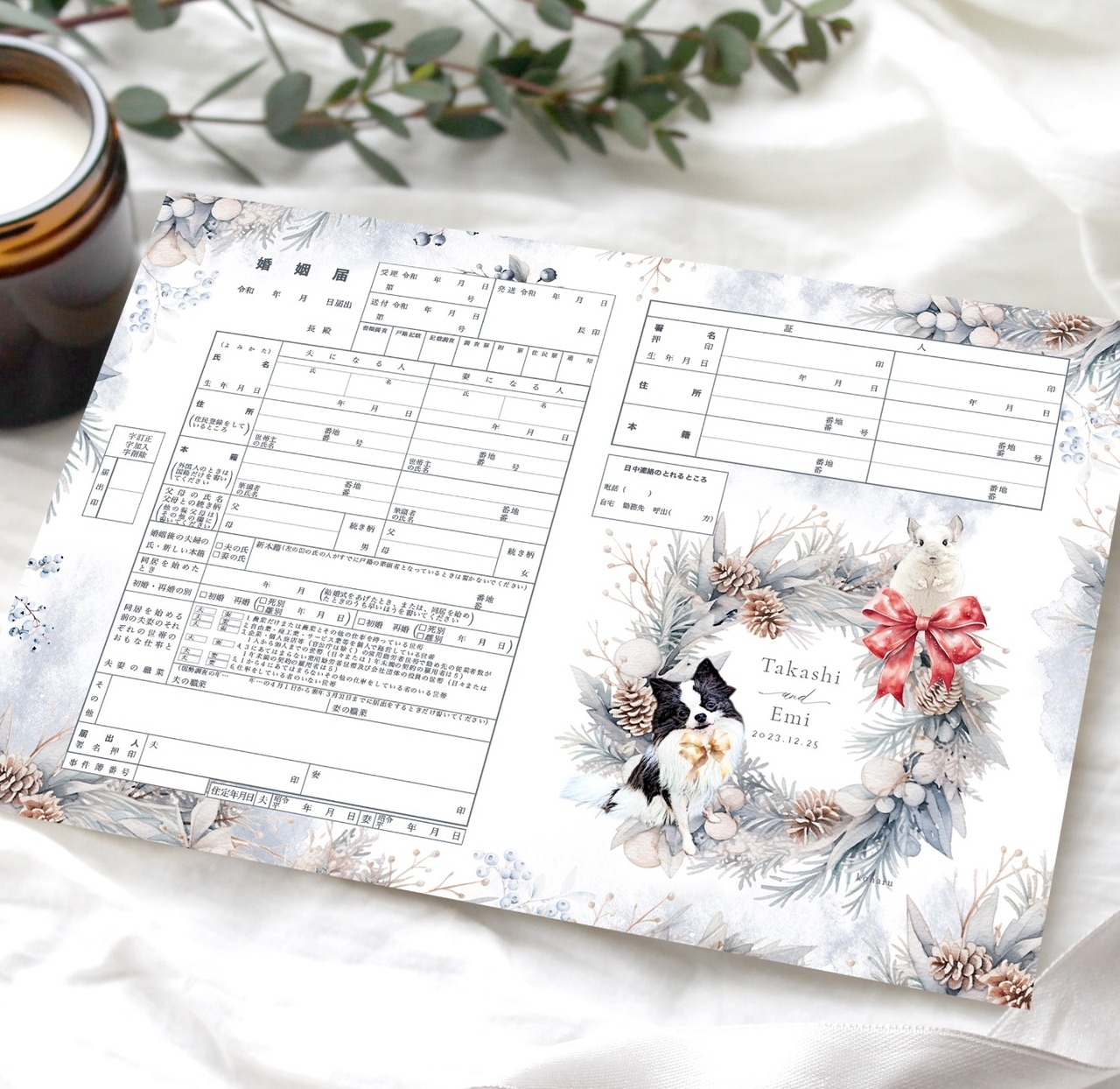 ペットの写真が入った、デジタルスケッチ加工 クリスマス リース★お洒落で可愛い婚姻届 切り抜き写真入れた完全オーダーメイド 愛犬 猫 写真入れ 文字入れ日付入れ 世界でたった1つの婚姻届