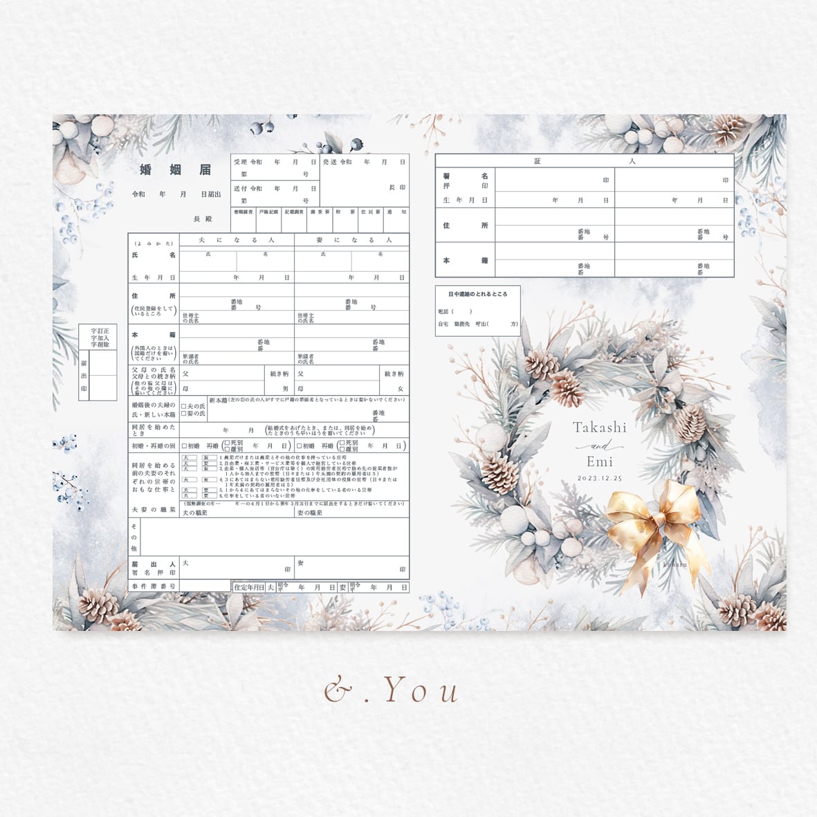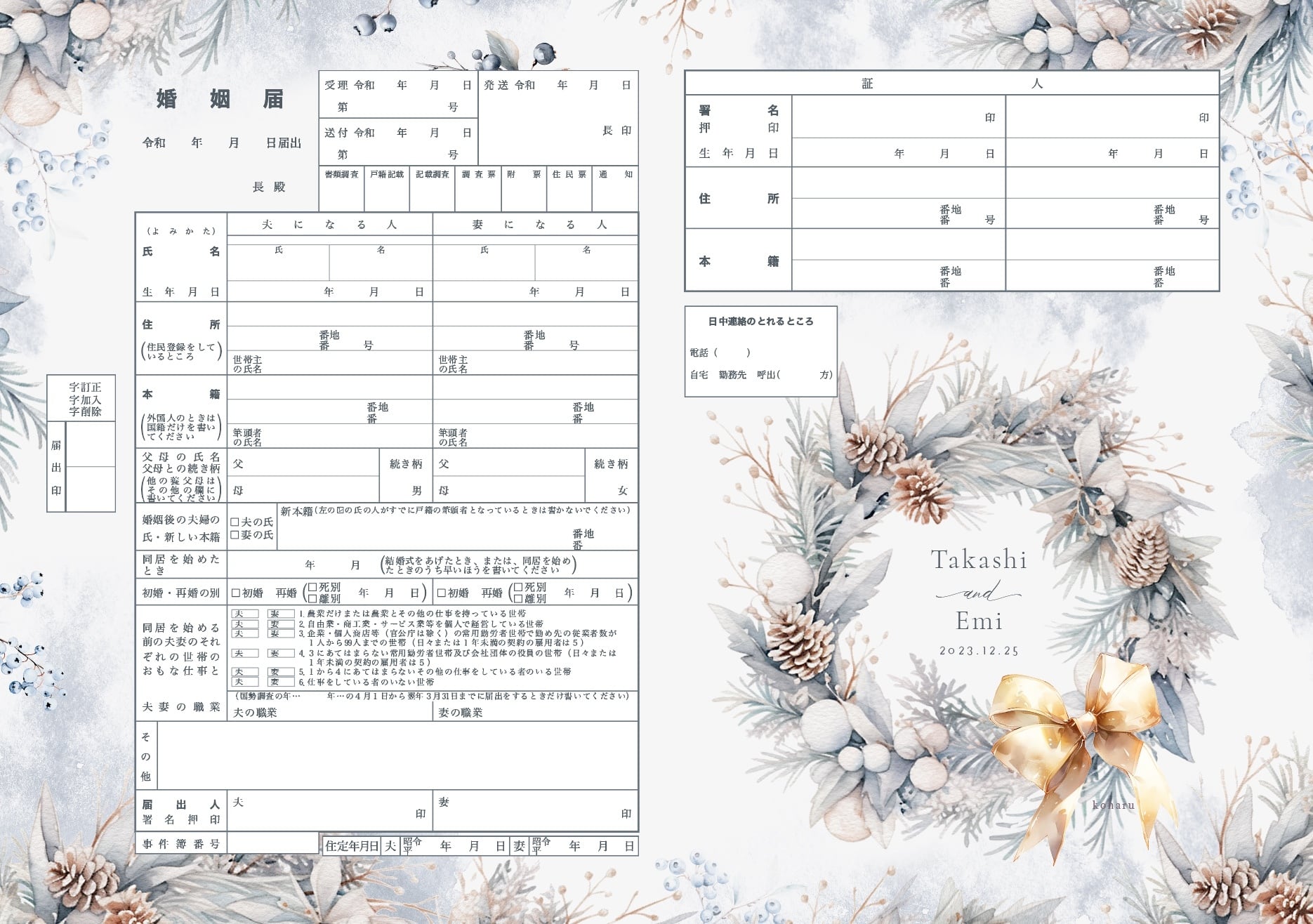 役所提出用 婚姻届 オシャレ クリスマス xmas Chiristmas Xmas リース 水彩画 名入れ日付入りで作成