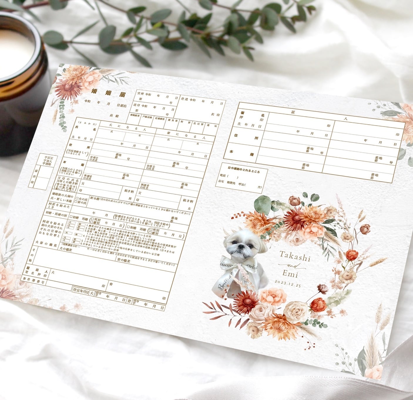 ペットのお写真を入れたオーダー婚姻届 役所提出可能 水彩オータムリーフ 秋冬 お好きなお写真でお作りします。写真入れ 名入れ 日付入れ セミオーダーメイド オリジナル